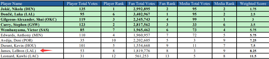 詹姆斯最终的球迷票数是1819776票,在西部排名第8,他的媒体票得到3张,在西部排名第9,他的球员票得到53张,在西部排名第8。他的加权积分是8.25,总票数排名西部第9,落后于约基奇、东契奇、亚历山大、库里、文班亚马、爱德华兹、阿夫迪亚、杜兰特。